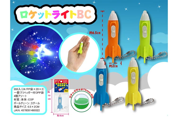 ロケットライトBC 【商品コード】0043124 【JAN】4570001498022 【参考上代】 ¥ 60 【メーカー】(有)トップエース ロケットライトBC おもちゃ 光るおもちゃ 光るおもちゃ・ライト (有)トップエース 【単価】 ¥ 60 在庫: ✕ 甲(入数:960): 税率:10%(課税) カートに入れる 直送・手配 備考